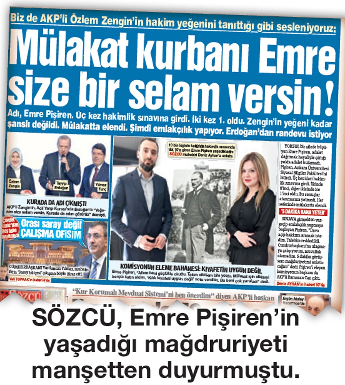 Dramını SÖZCÜ gündeme getirdi “Mülakat kurbanı Emre size selam versin” manşetiyle yankı yarattı. AKP Grup Başkanvekili Özlem Zengin, SÖZCÜ’nün haberinin ardından harekete geçerek, Emre’ye ulaştı ve “Emre’cim… Gazete manşetleri üzerinden ilettiğin görüşme talebin üzerine ben de buradan, kamuya açık bir şekilde, seni önümüzdeki hafta, TBMM’ye davet ediyorum” dedi. Pişiren de davete katılacağını söyledi.  Zengin, “Hafta için Emre’yi Meclis’e davet ettim. Ben mülakata karşı olduğumu her fırsatta dile getiriyorum. Geçen hafta Milli Eğitim bütçe görüşmelerinde de bunu belirttim’’ dedi.
